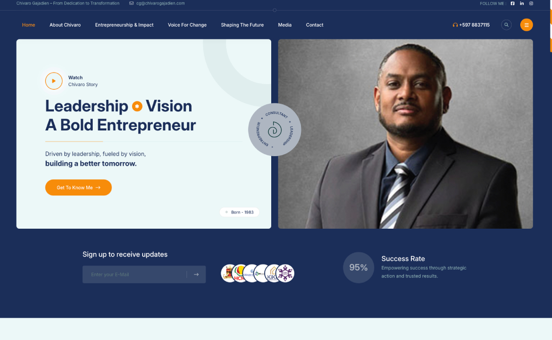 Our objective was to design a personal branding platform that highlights Chivaro Gajadien's journey, leadership, and vision.